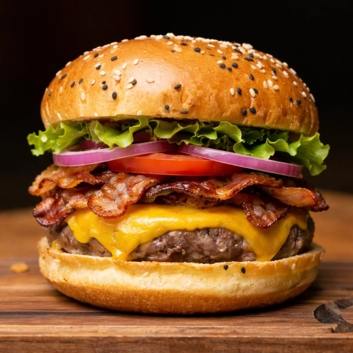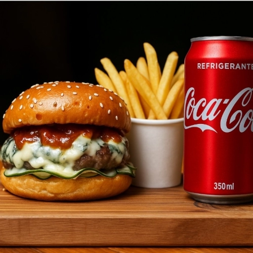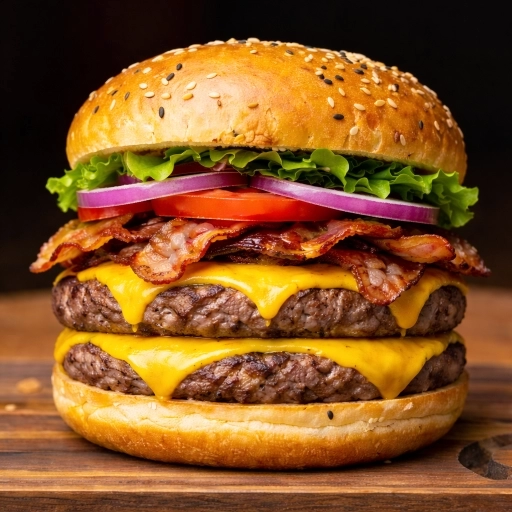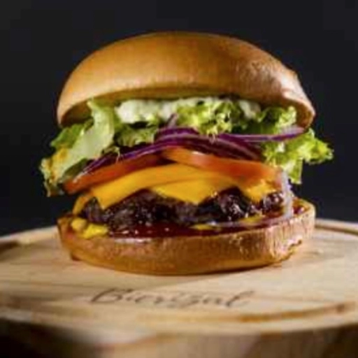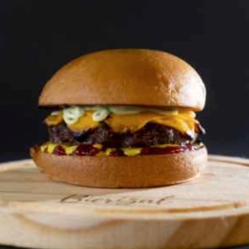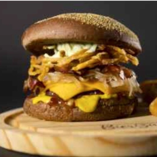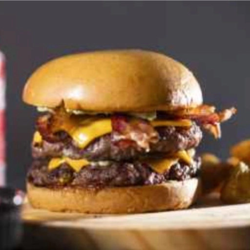 Pão brioche selado na brasa + 2 Blend 150gr + Queijo cheddar + Bacon defumado na parrilha + molhos( maionese da casa, c... Ver completo