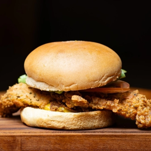 Pão de brioche selado na brasa + filé de frango crocante empanado + alface + tomate + molhos( maionese da casa, catchu... Ver completo