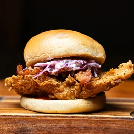 Pão de brioche selado na brasa + filé de frango empanado + salada coleslaw + bacon defumado na parrila + molhos( maion... Ver completo