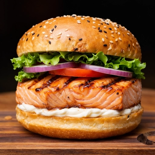 Pão com gergelim+ medalhão de salmão grelhado na parrilla + cream chesse + salada+ molhos( maionese da casa)