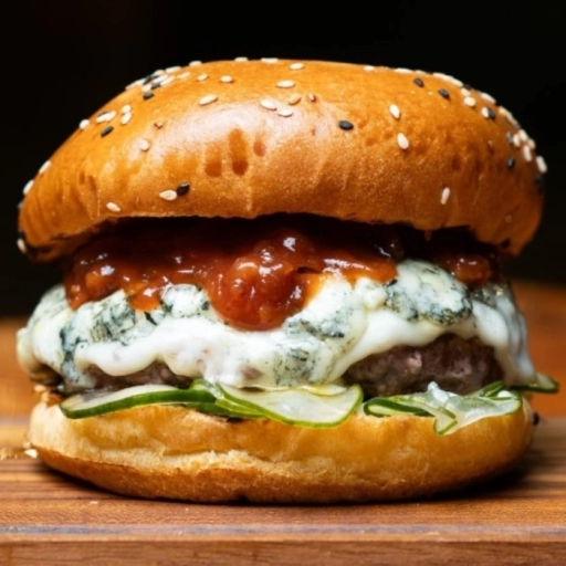 pão brioche + sunomono (pepino) + burger 150gr + queijo gorgonzola + molho goiabada + bacon em cubos + cebola crispy