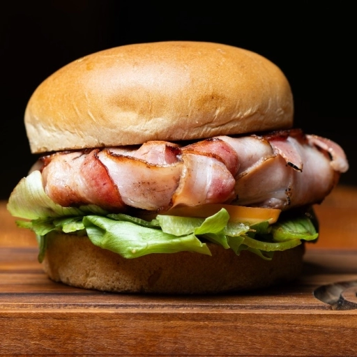 Pão brioche selado na brasa + Blend 150gr + Alface, tomate e cebola roxa + 100 gr Bacon trançado defumado na parrilha ... Ver completo