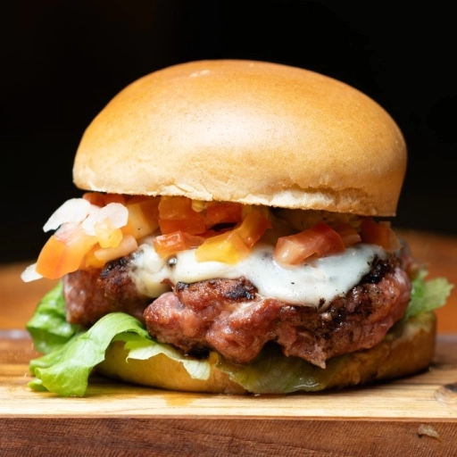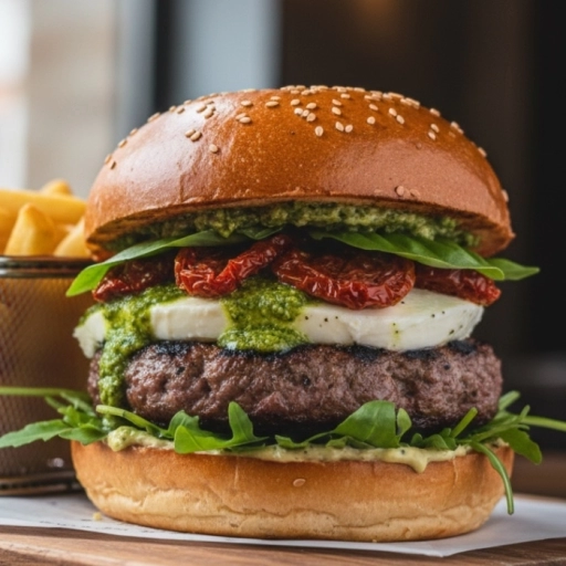 Pão premium selado na brasa + Blend 200gr + 120gr Queijo mussarela de búfala chapeada+ rucula + tomates seco+ pesto de... Ver completo